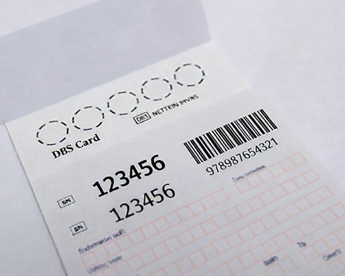 The multipart dried blood spot card consists of three parts or more and can be printed in black or OCR. Similar to the two-part card, the DBS sample area is attached to the demographic card and can have one or two top carbon layers for transferring information.